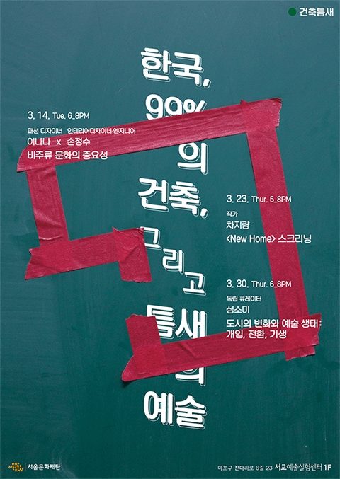 <한국, 99%의 건축, 그리고 틈새의 예술> 도시 속 99%의 건축은 용적률과 같은 제약 속에서 최대한의 자본을 추구하며 흘러간다.그리고 자본에 의해 흘러가는 99%의 건축물 속에서 예술가들은 헤매는 삶을 살아야 한다.건축의 틈새에 끼어버린 한국의 예술가들은 과연 어떻게 생존해야 하는 것일까. 그...