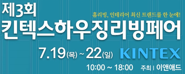 명 칭 : 2018 킨텍스하우징리빙페어기 간 : 2018년 7월 19일(목) ~ 7월 22일(일) / 4일간장 소 : 킨텍스 1전시관 4홀시 간 : 10:00 ~ 18:00 / (입장 마감 : 17:30)주 최 : (주)이앤애드 전시 취지가구 및 홈인테리어 최신 제품과 트랜드를 한 눈에, 킨텍스하우징리빙페어로 초대합니다.홈인테리어, 가구, 주...