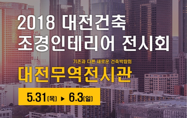 전시회 개요명칭 : 2018 대전 건축·조경·인테리어 전시회기간 : 2018년 5월 13일(목) ~ 6월 3일(일), 4일간장소 : 대전무역전시관규모 : 160개 기업 / 옥내 250부스 / 옥외 100부스주최 : KeyPlan후원 : (사)대전건설자재협회건물 내,외장재/바닥재.구조재 : 석재.몰딩.타일.벽돌.목재 등급수/욕실위생 설비재 : ...